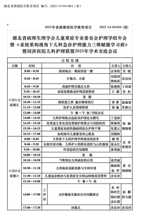 为深入贯彻国务院办公厅发布的《关于推进医疗联合体建设和发展的指导意见》(国办发〔2017〕32 号)、国家卫生健康委办公厅《关于开展“互联网+护理服务”试点工作的通知》(国卫办医函〔2019〕80号)、国务院办公厅关于推动公立医院高质量发展的意见(国办发〔2021〕18号)、湖北省卫生健康委员会印发的《湖北省医联体建设规划(2019—2020年)》(鄂卫发〔2018〕5号)等文件精神,充分发挥同济医院在儿科护理的区域技术示范作用,提升地方医疗机构服务能力,更好地满足广大基层人民群众医疗服务需求,探讨儿科急诊护理能力提升的前沿知识,华中科技大学同济医学院附属同济医院将于2025年11月21—2025年11月22日举办湖北省继续教育项目——“系统重构视角下儿科急诊护理能力三维赋能”学习班(项目编号:2025-14-04-004)。